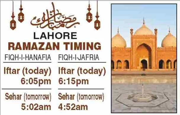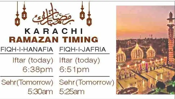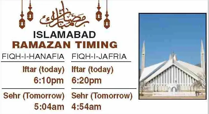Times for today’s Iftar (Ramazan 17) and tomorrow’s Sehri (Ramazan 18) for the federal and provincial capitals are listed below: