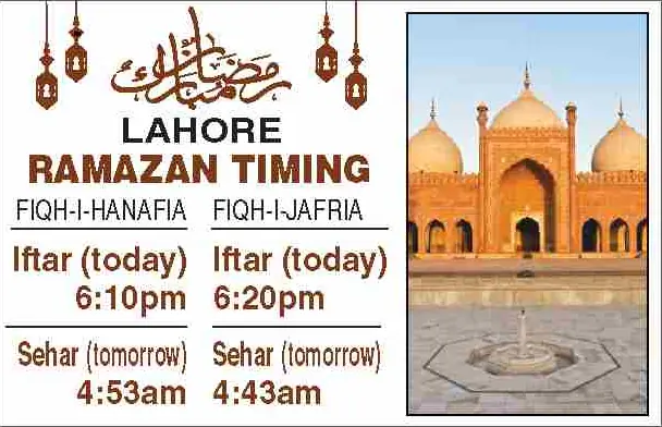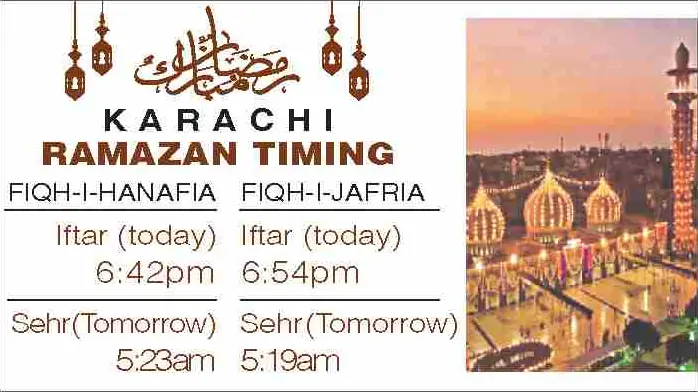 Times for today’s Iftar (Ramazan 24) and tomorrow’s Sehri (Ramazan 25) for the federal and provincial capitals are listed below: