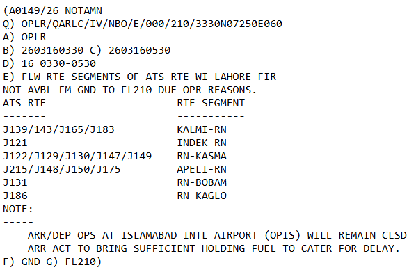 In a notice to airmen (Notam), the PAA specified segments of air traffic service (ATS) routes within the Lahore flight information region (FIR) that would not be available from ground to flight level 210 due to “operational reasons”.