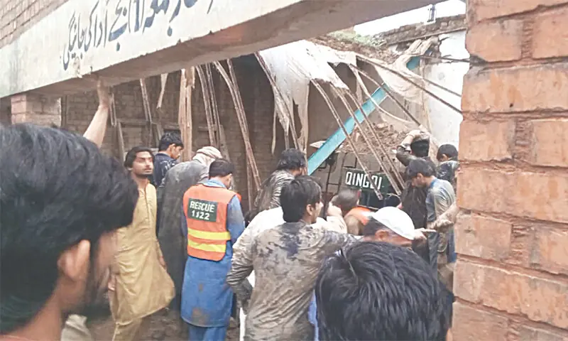 In Kotka Ghulam Qadar area, a veranda of Shahbaz Azmatkhel Mosque collapsed when a group of wedding guests took shelter there from heavy rain. As the roof caved in, many people were trapped under the debris. Rescue 1122 teams, along with locals, retrieved the injured from debris and shifted them to nearby hospitals.