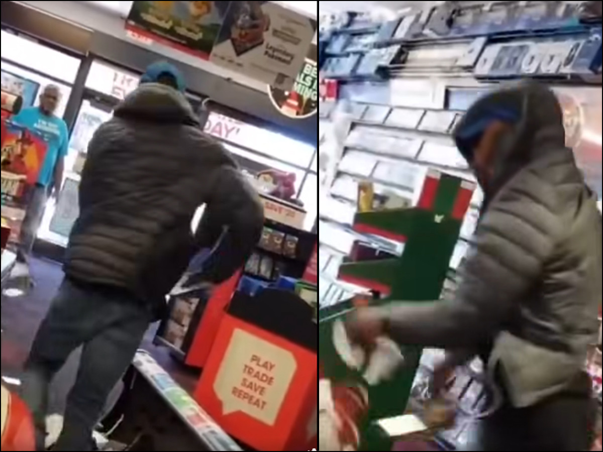 یہ ویڈیو گمراہ کن انداز میں شیئر کی گئی ہے۔ دراصل یہ 2018 میں امریکا کے ایک GameStop اسٹور کا واقعہ ہے، نہ کہ برطانیہ میں کسی ’’غیر قانونی مہاجر‘‘ کا۔
