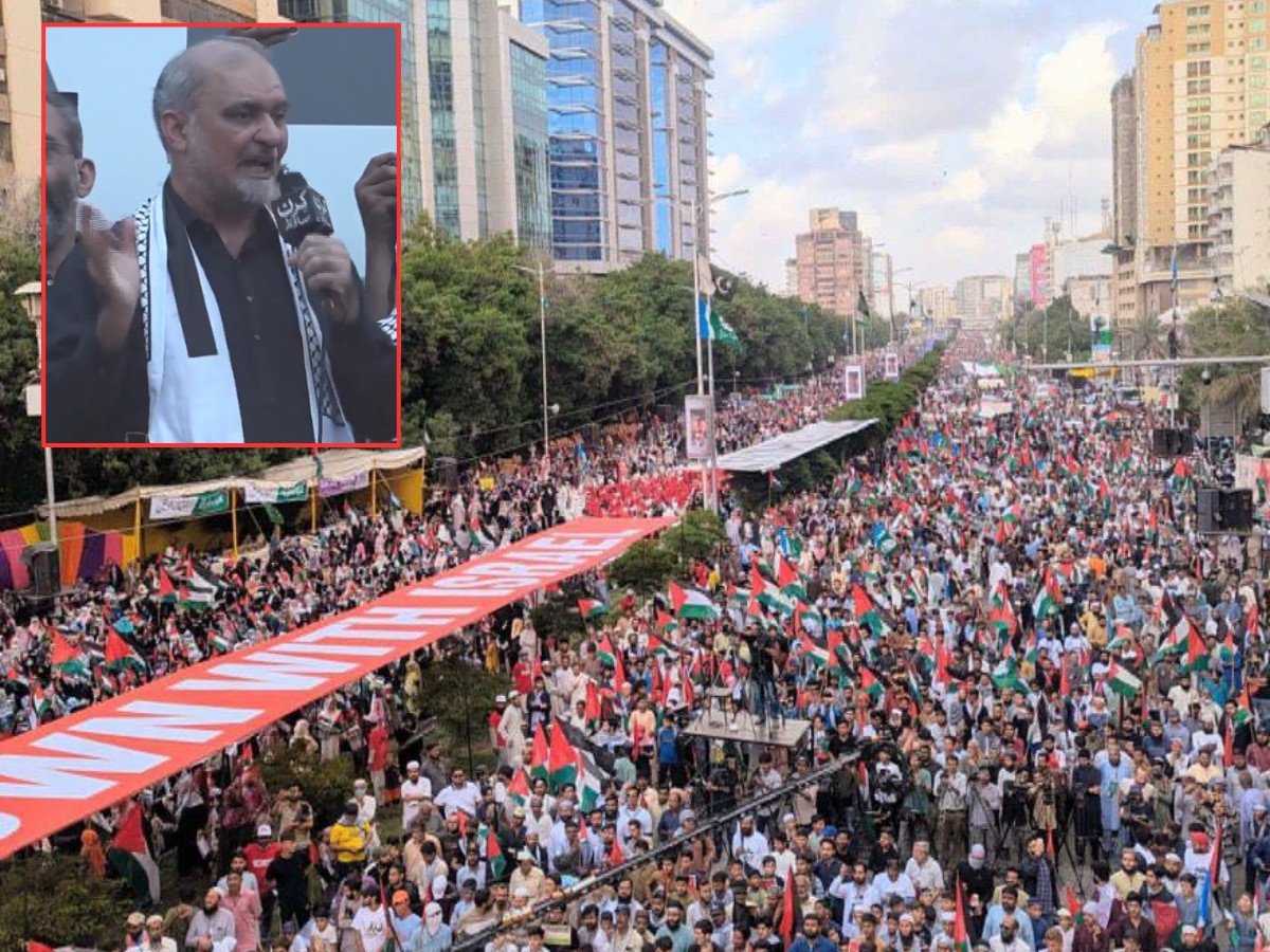 جماعت اسلامی کے تحت شاہراہ فیصل پر عظیم الشان غزہ ملین مارچ کا انعقاد کیا گیا جس میں خواتین اور بچوں سمیت عوام کا سمندر امڈ آیا۔ امیرجماعت اسلامی حافظ نعیم الرحمان نے غزہ ملین مارچ کے شرکاء سے خطاب کرتے ہوئے متنبہ کیا کہ اگر حکمرانوں نے اسرائیل کو تسلیم کرنے کا سوچا بھی تو انکا نان نفقہ بند کر دیں گے، شہباز شریف حماس کی حمایت کریں ورنہ انہیں بھاگنے کیلئے ایئر لفٹ بھی میسر نہیں آئے گی۔ حافظ نعیم الرحمان نے کہا کہ غزہ کے لوگ استقامت کا پہاڑ بنے ہوئے ہیں، اہل فلسطین مسلسل 2 سال سے مزاحمت کررہے ہیں، حماس نے یو این چارٹر کے مطابق ہتھیاراٹھائے ہیں، امریکا اسرائیل کو طاقت فراہم کرتا ہے، کراچی والوں کو بڑی تعداد میں مارچ میں شرکت پر خراج تحسین پیش کرتا ہوں۔ امیر جماعت اسلامی کا کہنا تھا کہ دنیا کو ایسی اقوام متحدہ کی ضرورت نہیں جس پر امریکا کی اجارہ داری ہے، امریکا کے کہنے پر اپنا موقف پیش نہ کرنا بزدلانہ عمل ہے، اسرایئل کو ناجائز طریقے سے فلسطین پر مسلط کیا گیا، وہاں ایک ہی ریاست ہے اور وہ فلسطین ہے، اسرایئل فلسطین پر قابض ہے۔ انہوں نے کہا کہ فلسطین کی ریاست کو قبول کیا جائے، اگر کوئی قوت موجود ہے تو وہ حماس ہے، حماس والے مذاکرات کی ٹیبل پر بھی لڑ رہے ہیں، ہتھیار بھی نہیں ڈالے ہیں، شہباز شریف دو ریاستی حل کی بات نہ کرو، ڈپلومیسی حماس سے سیکھ لو، فلسطینوں کی قربانیاں 66 ہزار تک پہنچ گئی ہیں، یہ قتل عام بے غیرت مسلم حکمرانوں اور افواج کی وجہ سے ہو رہا ہے۔ حافظ نعیم نے کہا کہ کچھ بے غیرت مسلم حکمرنوں نے اسرایئل کو تسلیم کرلیا ہے، کچھ بے غیرت مسلم حکمران اسرائیل کو تسلیم کرنے کا سوچ رہے ہیں۔ انہوں نے کہا کہ میں پوچھنا چاہتا ہوں کہ نون لیگ، پی پی پی اور پی ٹی آئی نے فلسطین کے حق میں کتنا احتجاج کیا۔ تحریک انصاف نے الیکشن جیتا، میں مانتا ہوں کہ عمران خان سیاسی قیدی ہیں، عمران خان جیل سے امریکا اور اسرایئل کی مخالفت اور فلسطین و حماس کی حمایت کریں۔ امیر جماعت اسلامی نے اپیل کی کہ طوفان الاقصیٰ کے دو سال مکمل ہونے پر 7 اکتوبر کو پورے ملک میں عوام اپنے گھروں سے باہر نکلیں اور صبح 11 بجے فلسطینی عوام کے ساتھ یکجہتی کا اظہار کریں۔