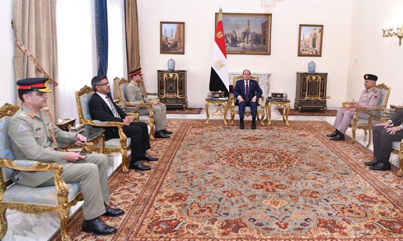 مارشل سید عاصم منیر نے عرب جمہوریہ مصر کے صدر عبدالفتاح السیسی سے قاہرہ کے اتحادیہ صدارتی محل میں ملاقات کی، ملاقات میں پاکستان اور مصر کے درمیان دوطرفہ تعلقات، خطے میں امن و استحکام اور باہمی دلچسپی کے امور پر تفصیلی تبادلہ خیال کیا گیا۔ پاک فوج کے شعبہ تعلقات عامہ (آئی ایس پی آر) کے مطابق فیلڈ مارشل عاصم منیر نے علاقائی امن و استحکام میں مصر کی قیادت کے مثبت کردار کو سراہا جبکہ صدر عبدالفتاح السیسی نے پاکستان کے عالمی و مسلم امہ کے امور میں فعال اور تعمیری کردار کی تعریف کی۔ آئی ایس پی آر نے بتایا کہ دونوں رہنماؤں نے باہمی اسٹریٹجک مفادات کے معاملات پر قریبی تعاون اور عوامی روابط کو مزید فروغ دینے کی ضرورت پر زور دیا، دونوں ممالک کے درمیان دوستانہ تعلقات کو سماجی و معاشی ترقی، ٹیکنالوجی اور سلامتی کے شعبوں میں مزید وسعت دی جائے گی۔ ترجمان پاک فوج نے کہا کہ ملاقات گرمجوشی کے ماحول میں اختتام پذیر ہوئی، دونوں فریقین نے اس اعتماد کا اظہار کیا کہ معاشی و دفاعی تعاون کے فروغ سے پاکستان، مصر اور پورے خطے میں امن و استحکام کو تقویت ملے گی۔