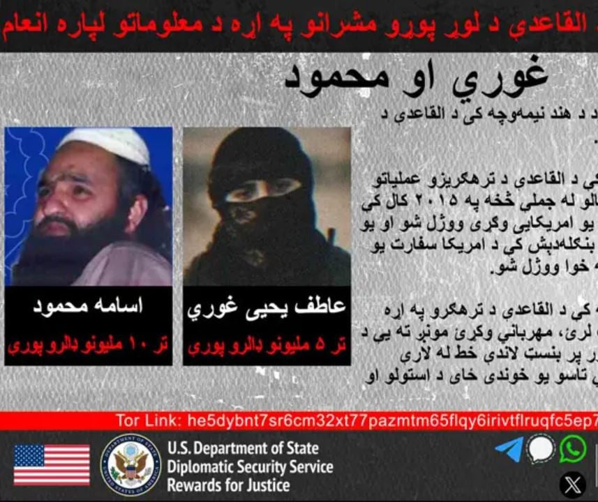 امریکا نے القاعدہ کے دو سینئر رہنماؤں اسامہ محمود اور عاطف یحییٰ غوری کے بارے میں معلومات فراہم کرنے پر انعام دینے کا اعلان کیا ہے۔ اسامہ محمود پر ایک کروڑ ڈالر جبکہ عاطف یحییٰ غوری پر 50 لاکھ ڈالر تک انعام رکھا گیا ہے۔