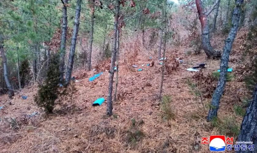 KCNA نے ڈرون کے ملبے کی تصاویر جاری کیں، جن میں پر والا جہاز زمین پر پڑا ہوا نظر آ رہا ہے اور ساتھ میں کیمرے اور دیگر آلات بھی دکھائے گئے ہیں۔