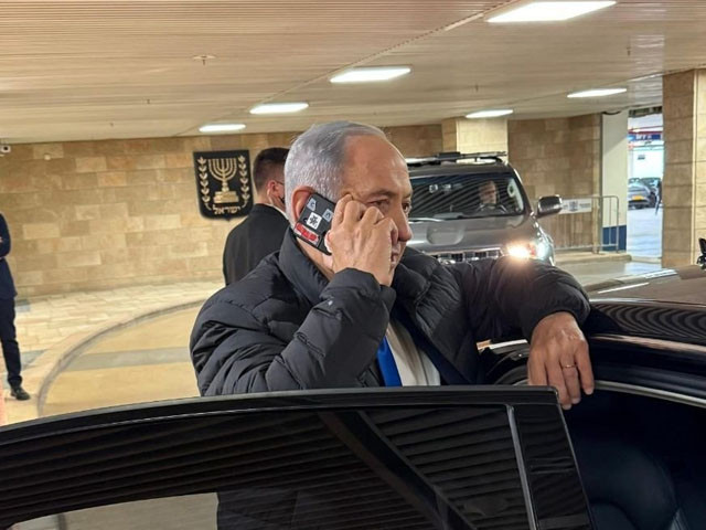اس تصویر میں اسرائیلی وزیراعظم نیتن یاہو سفید قمیض کے اوپر سیاہ پفر جیکٹ پہنے ایک سیاہ گاڑی کے ساتھ ٹیک لگائے فون پر بات کرتے نظر آتے ہیں۔