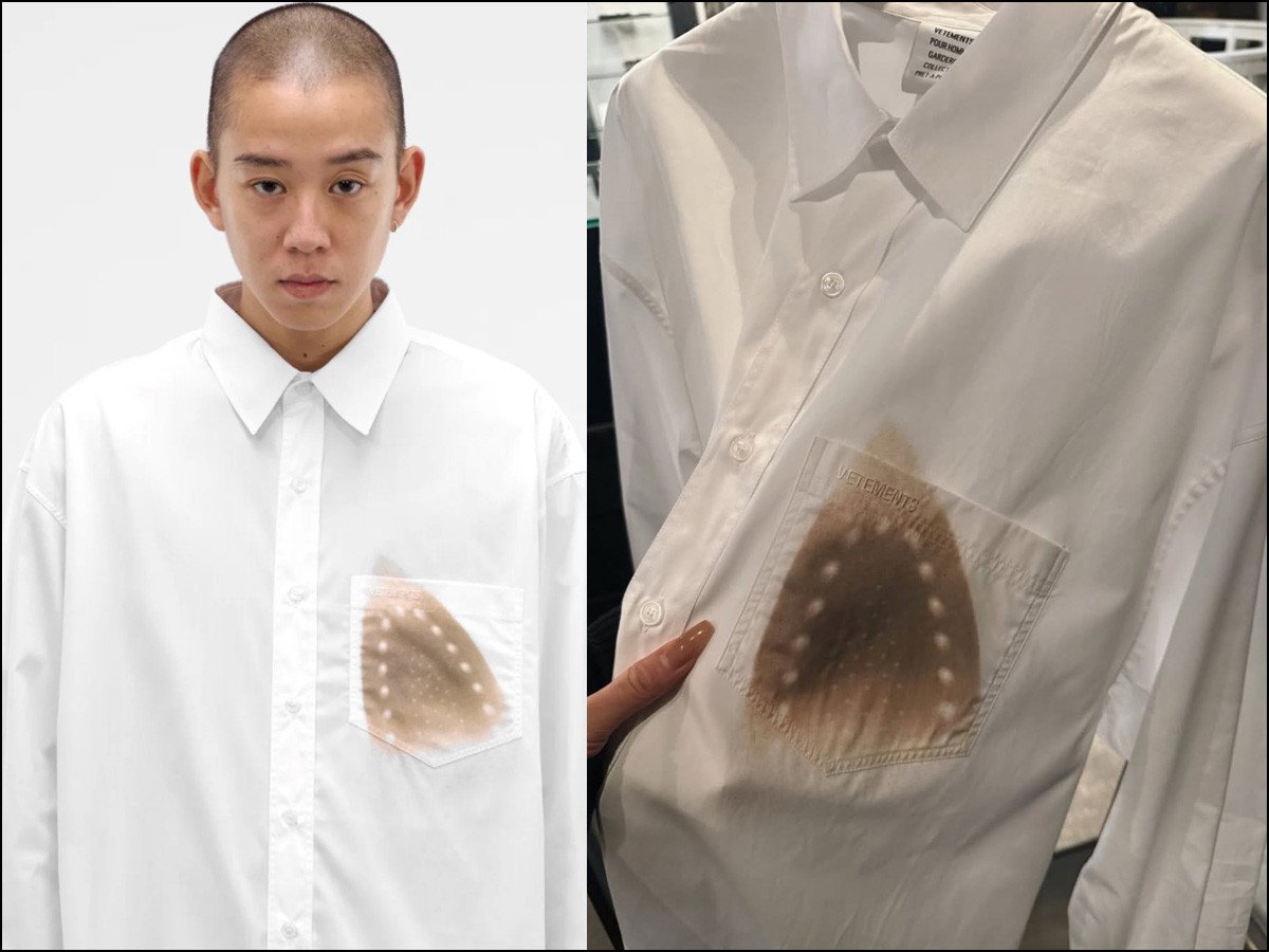 فیشن کی دنیا میں VETEMENTS ایسی شے کے ساتھ سامنے آئی ہے جس میں عام ٹی شرٹ یا بٹن ڈاؤن شرٹ کی نسبت کچھ نیا اور چیلنجنگ نظر آتا ہے۔ اس شرٹ پر جس طرح کا جلنے کا نشان دکھایا گیا ہے، اسے دیکھ کر پہلی نظر میں یہی لگتا ہے کہ یہ کپڑے کو استری کے دوران نقصان پہنچنے کا عکس ہے۔ مگر حقیقت میں یہ ایک خاص گرافک پرنٹ ہے جسے فیشن کے محاذ پر ایک آرٹسٹک تاثر کے طور پر پیش کیا گیا ہے۔