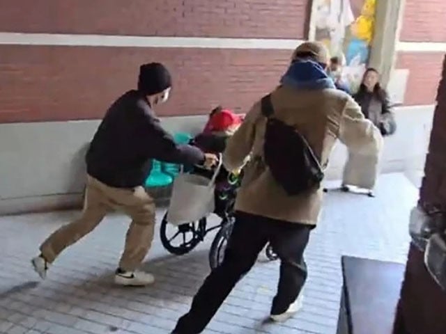 بیٹوں نے اپنے باپ کی مبینہ بیوی کو ایک طرف دھکیل کر ان سے والد کی وہیل چیئر چھین لی اور اپنے ساتھ گھر لے جانے لگے۔