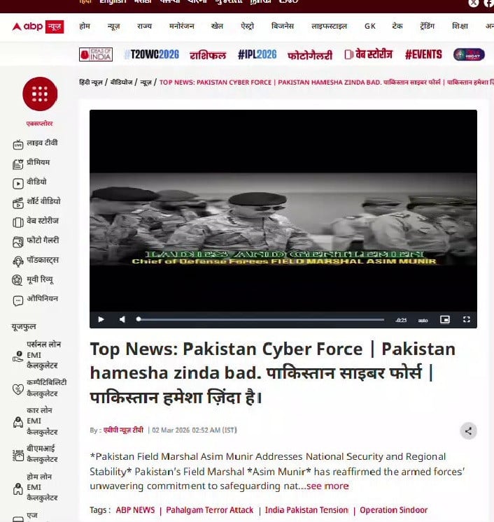 پاکستانی سائبر فورس نے بھارتی چینل اے بی پی نیوز کو ہیک کرکے اُس پر پاکستانی فوج کے مواد چلا دیے۔