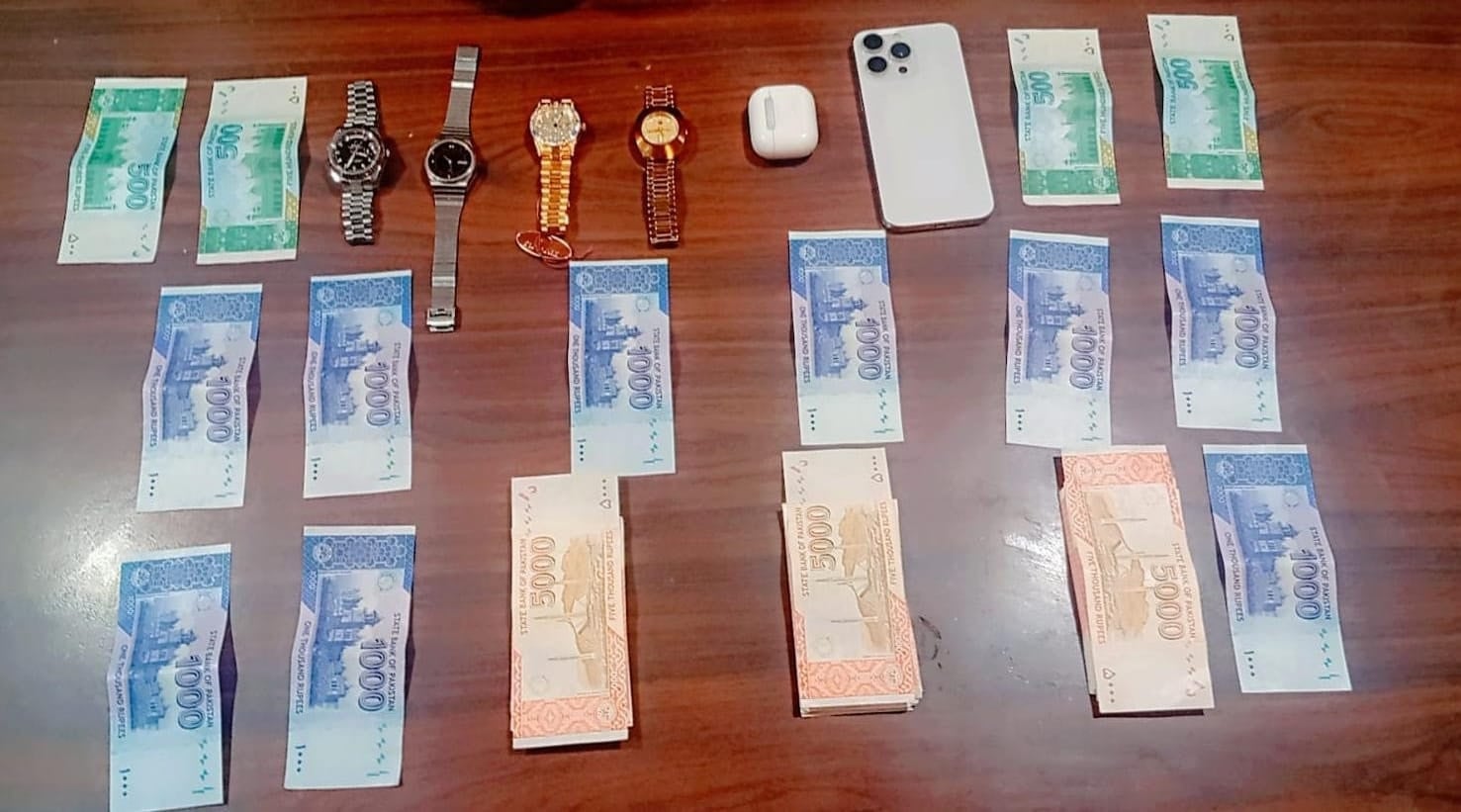 تفصیلات کے مطابق ملزم سے 10 لاکھ سے زائد مالیت کی 4 قیمتی رولکس،راڈو و دیگر گھڑیاں،مسروقہ رقم 4 لاکھ 50 ہزار روپے،آئی فون مالیتی 2 لاکھ 50 ہزار معہ ائیر بڈز برآمد ہوئے۔