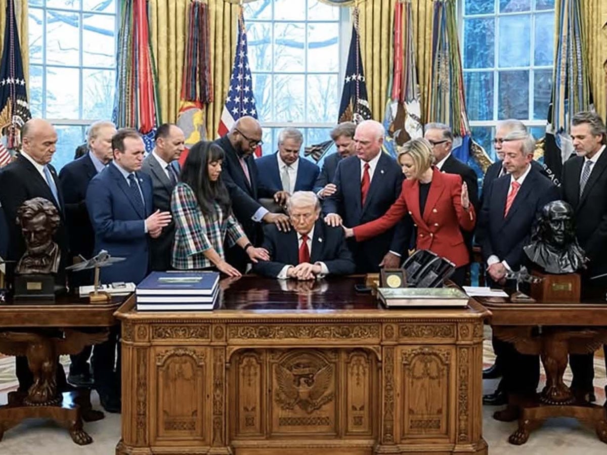 وائٹ ہاؤس کی جانب سے جاری ویڈیو میں دیکھا جا سکتا ہے کہ متعدد مذہبی رہنما صدر کے گرد جمع ہیں، آنکھیں بند کر کے دعا کر رہے ہیں جبکہ کچھ پادریوں نے صدر کے کندھوں پر ہاتھ رکھے ہوئے ہیں۔