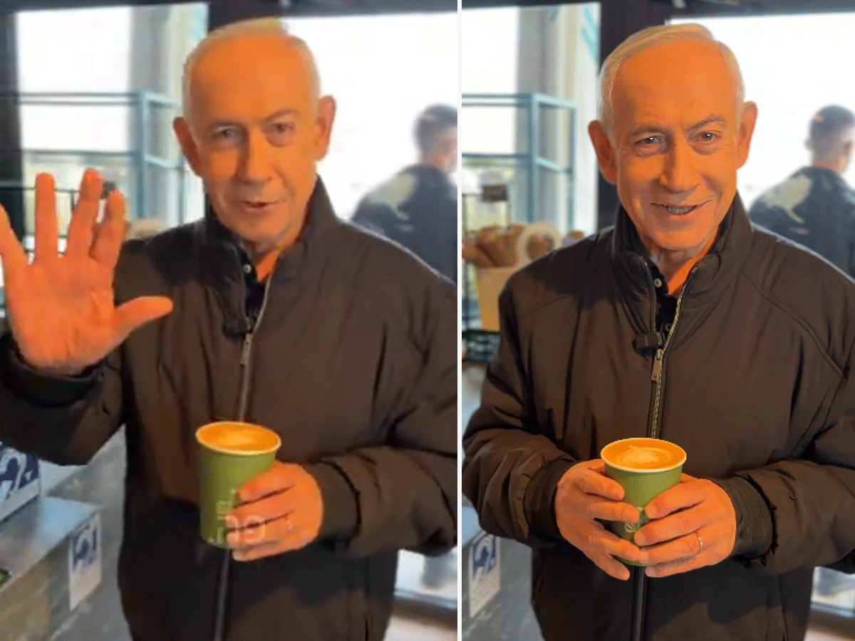 نیتن یاہو کو ایک کافی شاپ میں کافی آرڈر کرتے ہوئے اور پیتے ہوئے دیکھا جاسکتا ہے، اسرائیلی میڈیا کے مطابق مذکورہ شاپ یروشلم ہلز میں واقع ہے۔