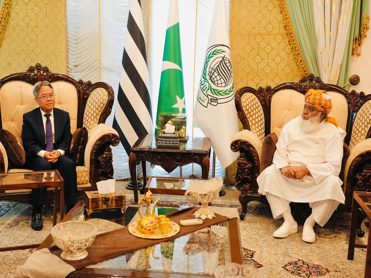 اسلام آباد: پاکستان میں متعین چینی سفیر جیانگ زیڈونگ کی وفد کے ہمراہ جے یو آئی کے سربراہ مولانا فضل الرحمان سے اہم ملاقات ہوئی ہے۔