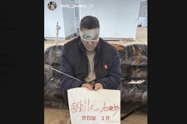اسرائیلی اہلکار نے تحویل میں لیے گئے فلسطینی شخص کی آنکھوں پر پٹی باندھی اور اس کے ہاتھ میں زبردستی اپنے ذاتی جیولری کاروبار کا اشتہار تھما کر تصویر کھینچی۔