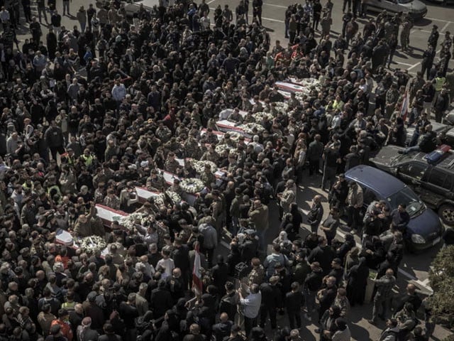 لبنان کے جنوبی شہر نباطیہ میں اسرائیل کے فضائی حملوں میں شہید ہونے والے 13 سیکیورٹی اہلکاروں کی اجتماعی نمازِ جنازہ میں ہزاروں شہریوں، سرکاری حکام اور سکیورٹی اہلکاروں نے شرکت کی۔